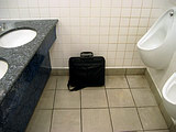 average bathroom stall, doors are narrower, and (laptop case left in