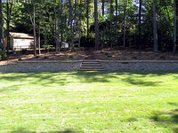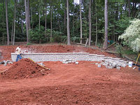 The wall construction begins! The stone we chose is Belgard's "Celtik Wall" system. It's not all that much more expensive than the stuff Home Depot sells and looks a zillion times better, and it was a lot less than going with real granite. | |